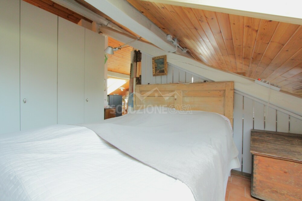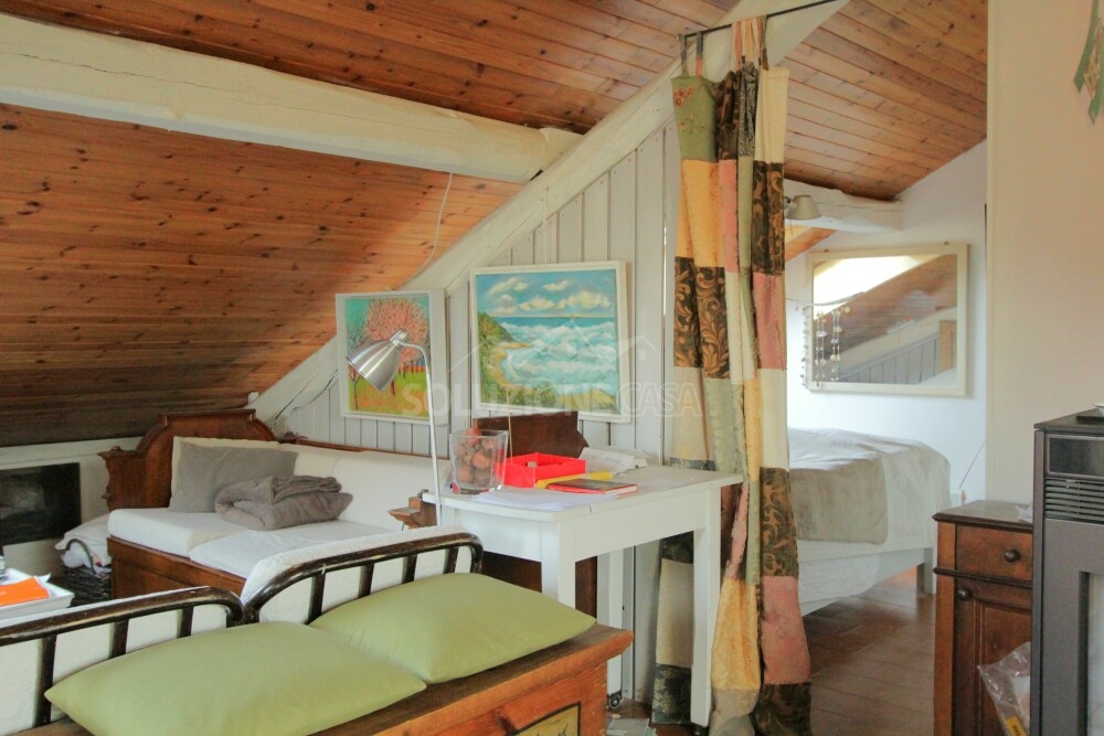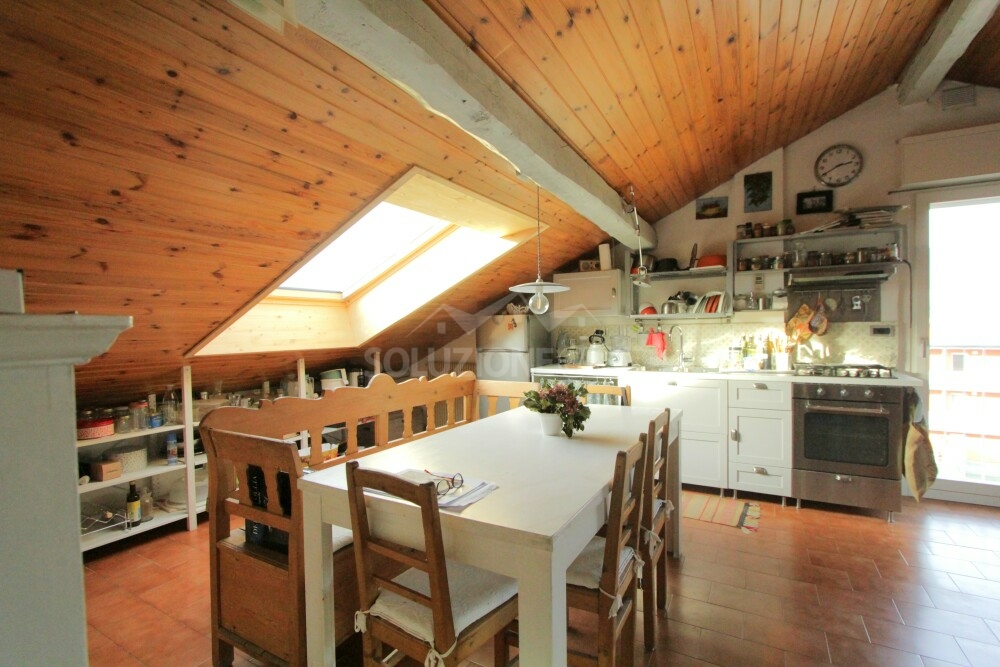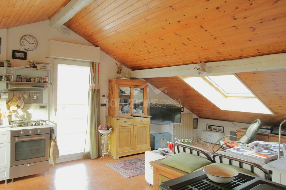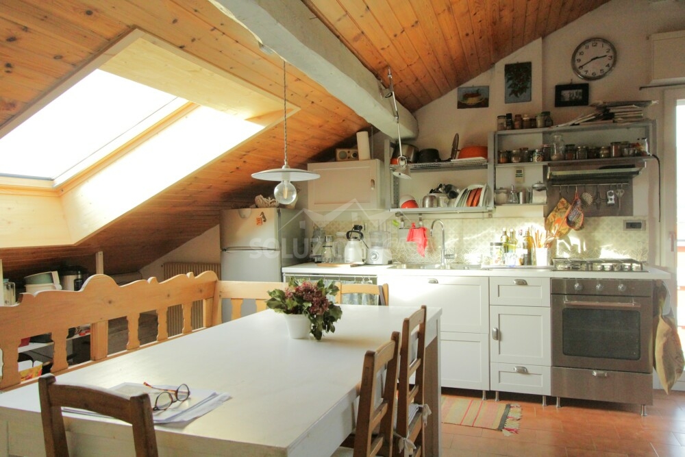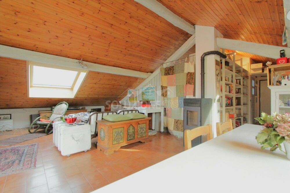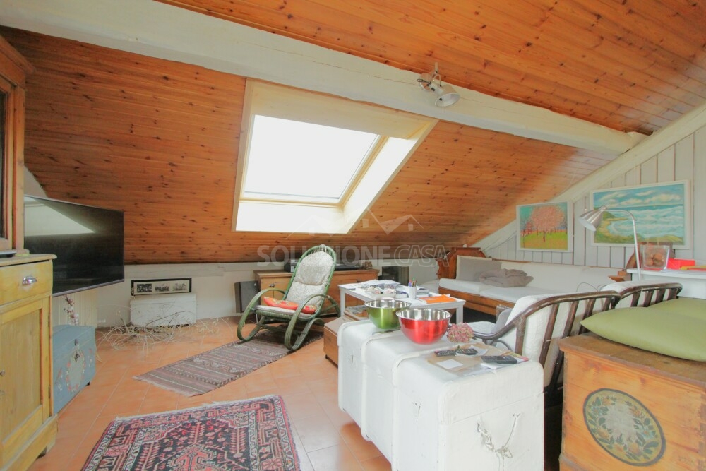 L'ambiente si presenta molto luminoso grazie a grandi finestre Velux che offrono inoltre una splendida vista panoramica anche sul castello di Pergine e a un'ampia porta-finestra.
