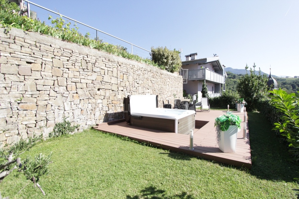 Il piano terra ospita gli ambienti di servizio e relax: locale caldaia, cantina, un’accogliente stube con cucina perfetta per pranzi in compagnia e due aree esterne distinte. La prima, coperta da tettoia, è arredata con divanetti e tavoli per godersi piacevoli momenti conviviali; la seconda è dedicata al benessere, con zona relax e piscina (attualmente attrezzata con una vasca idromassaggio).